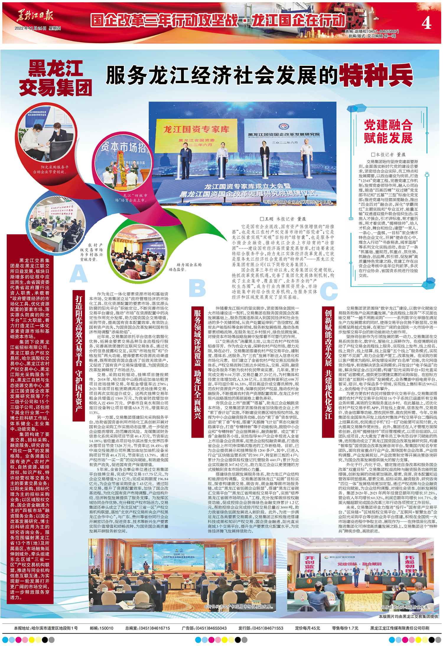 它是國有企業(yè)混改、國有資產(chǎn)保值增值的“助推器”,也是龍江農(nóng)村產(chǎn)權(quán)交易市場的“拓荒者”;它是龍江探索實(shí)現(xiàn)“雙碳”目標(biāo)的“綠智囊”,也是服務(wù)中小微企業(yè)融資、推動(dòng)龍江企業(yè)上市培育的“壯苗圃”……建設(shè)國有經(jīng)濟(jì)高質(zhì)量發(fā)展智庫,打造要素流轉(zhuǎn)綜合服務(wù)平臺(tái),助力龍江實(shí)體經(jīng)濟(jì)改革發(fā)展,它就是服務(wù)龍江經(jīng)濟(jì)社會(huì)發(fā)展的“特種兵”——黑龍江交易集團(tuán)有限公司(以下簡稱交易集團(tuán))。