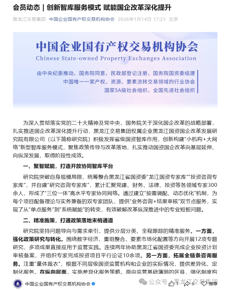 為深入貫徹落實(shí)黨的二十大精神及黨中央、國務(wù)院關(guān)于深化國企改革的戰(zhàn)略部署,扎實(shí)推進(jìn)國企改革深化提升行動(dòng),黑龍江交易集團(tuán)權(quán)屬企業(yè)黑龍江國資國企改革發(fā)展研究院有限公司(以下簡稱研究院)積極發(fā)揮省級國資智庫作用,創(chuàng)新構(gòu)建“小機(jī)構(gòu)+大網(wǎng)絡(luò)”新型智庫服務(wù)模式,聚焦政策傳導(dǎo)與改革落地,扎實(shí)推動(dòng)國資國企改革向基層延伸、向縱深發(fā)展,取得階段性成效。
