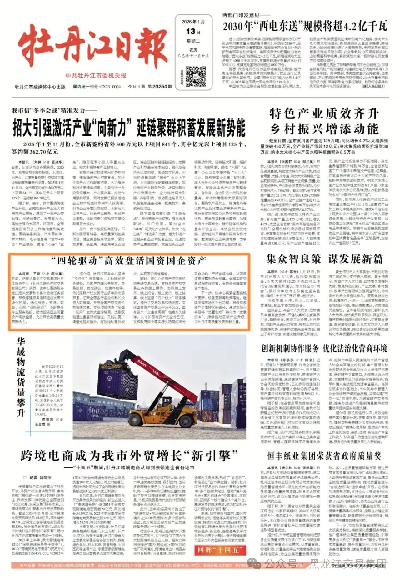 日前,記者從黑龍江交易集團(tuán)牡丹江服務(wù)中心(牡丹江聯(lián)合產(chǎn)權(quán)交易有限公司)獲悉,該中心圍繞服務(wù)龍江振興發(fā)展和市委市政府任務(wù)部署,積極搭建服務(wù)循環(huán)經(jīng)濟(jì)發(fā)展市場(chǎng)化橋梁,通過(guò)服務(wù),資源,數(shù)智,合規(guī)“四輪驅(qū)動(dòng)”,不斷提升專業(yè)服務(wù)能級(jí),助力國(guó)資國(guó)企閑置資產(chǎn)高效盤活,充分釋放高質(zhì)量發(fā)展新活力。